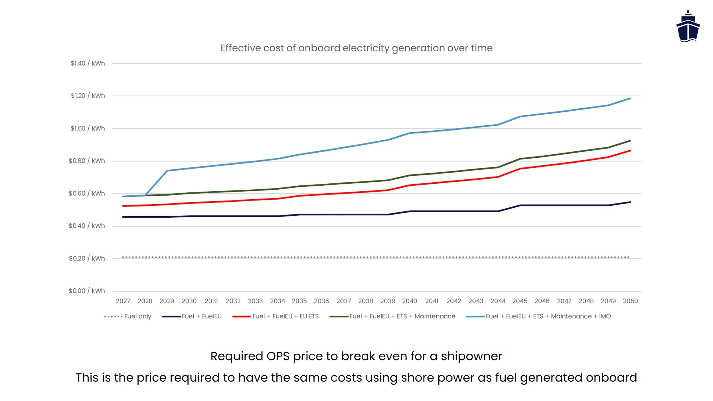 The break-even price has historically been around $0.20 per kWh, which is the typical cost of producing electricity with auxiliary engines burning marine fuel. Maintenance and consumables costs are typically not significant when compared to this price point (~ $0.03 per kWh) but it depends on ship type and operational profile. The decisive shift comes with upcoming regulations that introduce compliance penalties, i.e. ETS (EU or UK), FuelEU and IMO Net-Zero.