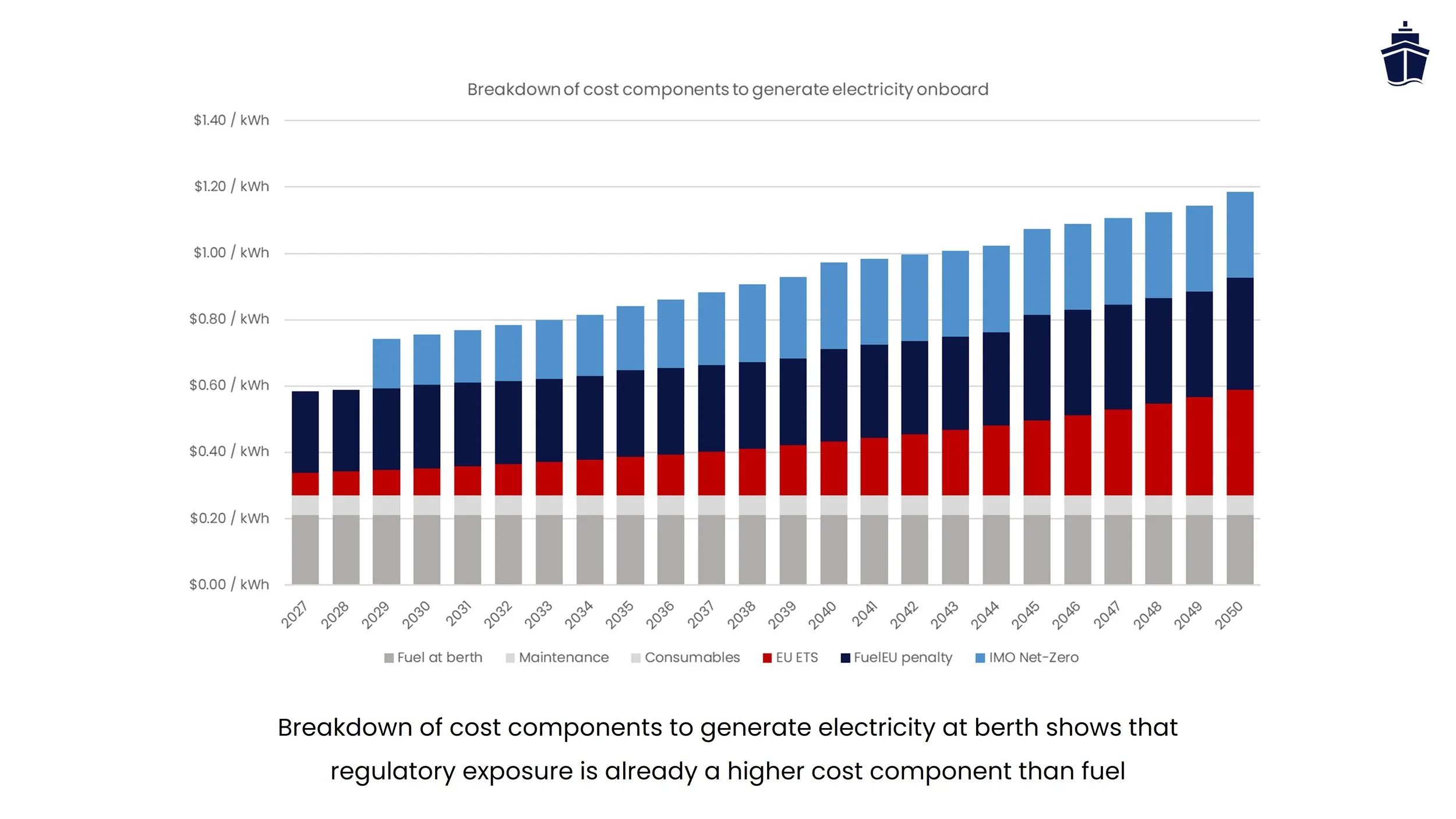 Costs to generate electricity onboard rise from ~$0.20 per kWh (fuel only) to ~$1.00 per kWh with full regulatory exposure in 2040