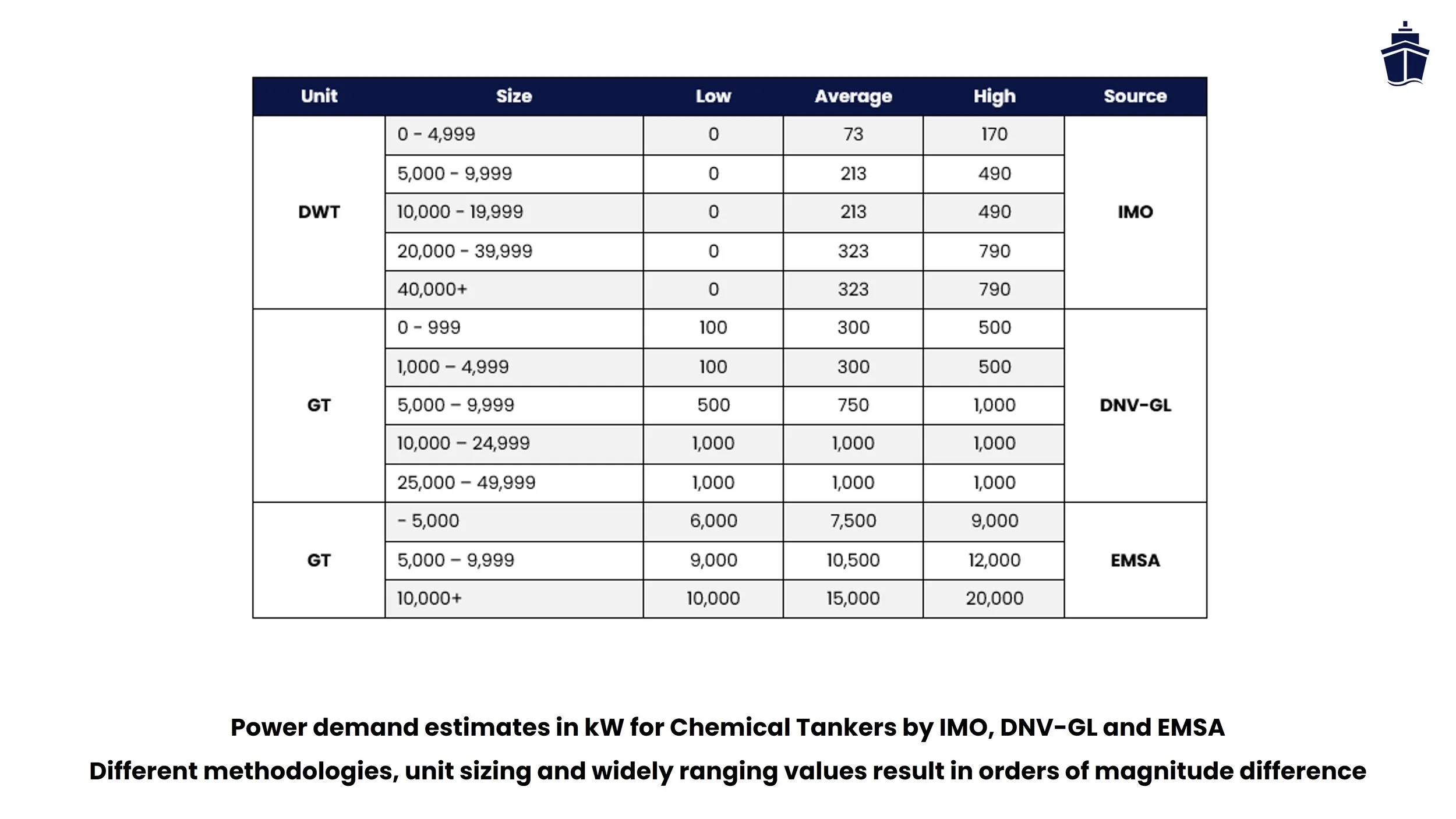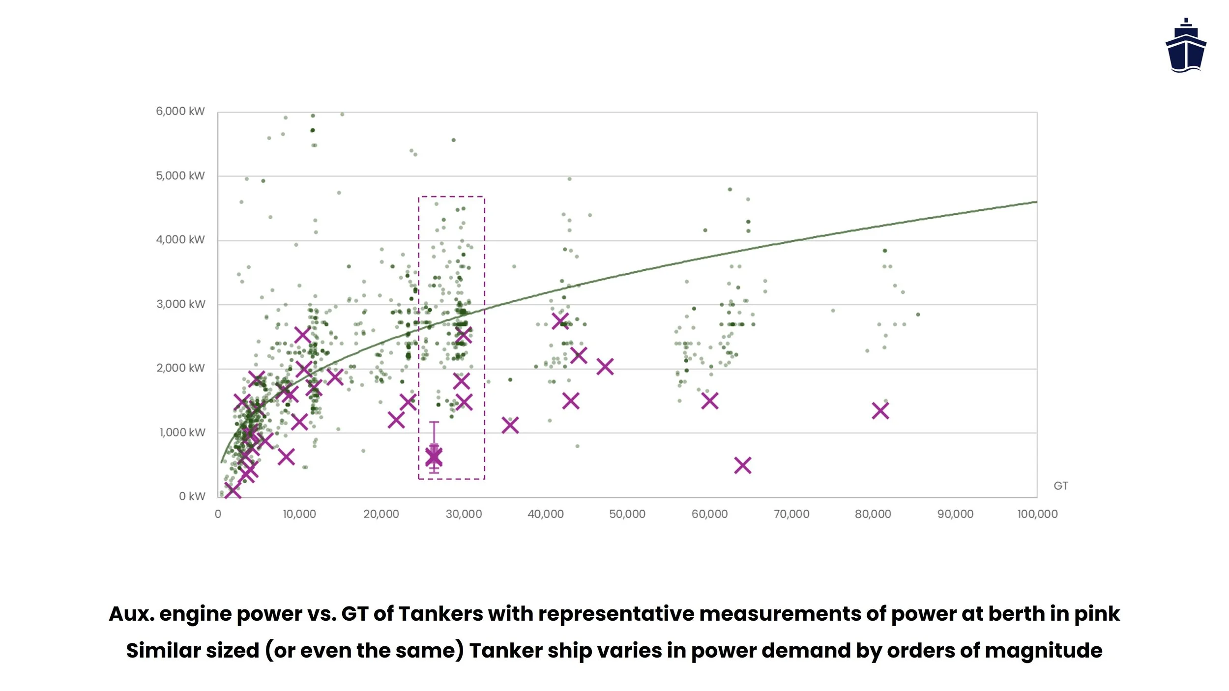 Compounding these issues is the fact that different sources use wildly varying different approaches on determining power demand. Reputable organizations such as the International Maritime Organization (IMO), the European Maritime Safety Agency (EMSA), DNV, and various academic studies use different ship classifications and size parameters, including Gross Tonnage (GT), Deadweight Tonnage (DWT), Twenty-foot Equivalent Units (TEU), and cubic capacity (m3). Units, aggregation methods, and operational assumptions also differ. Some sources provide binned averages by size range (between 1,000 and 5,000 GT for example), others rely on installed auxiliary power, while some derive values from measured time-series data. Survey-based datasets remain the most common basis for estimating auxiliary demand in port emission inventories, but these are often overestimated by the shipowner. These differences in approaches make cross-comparison impossible.