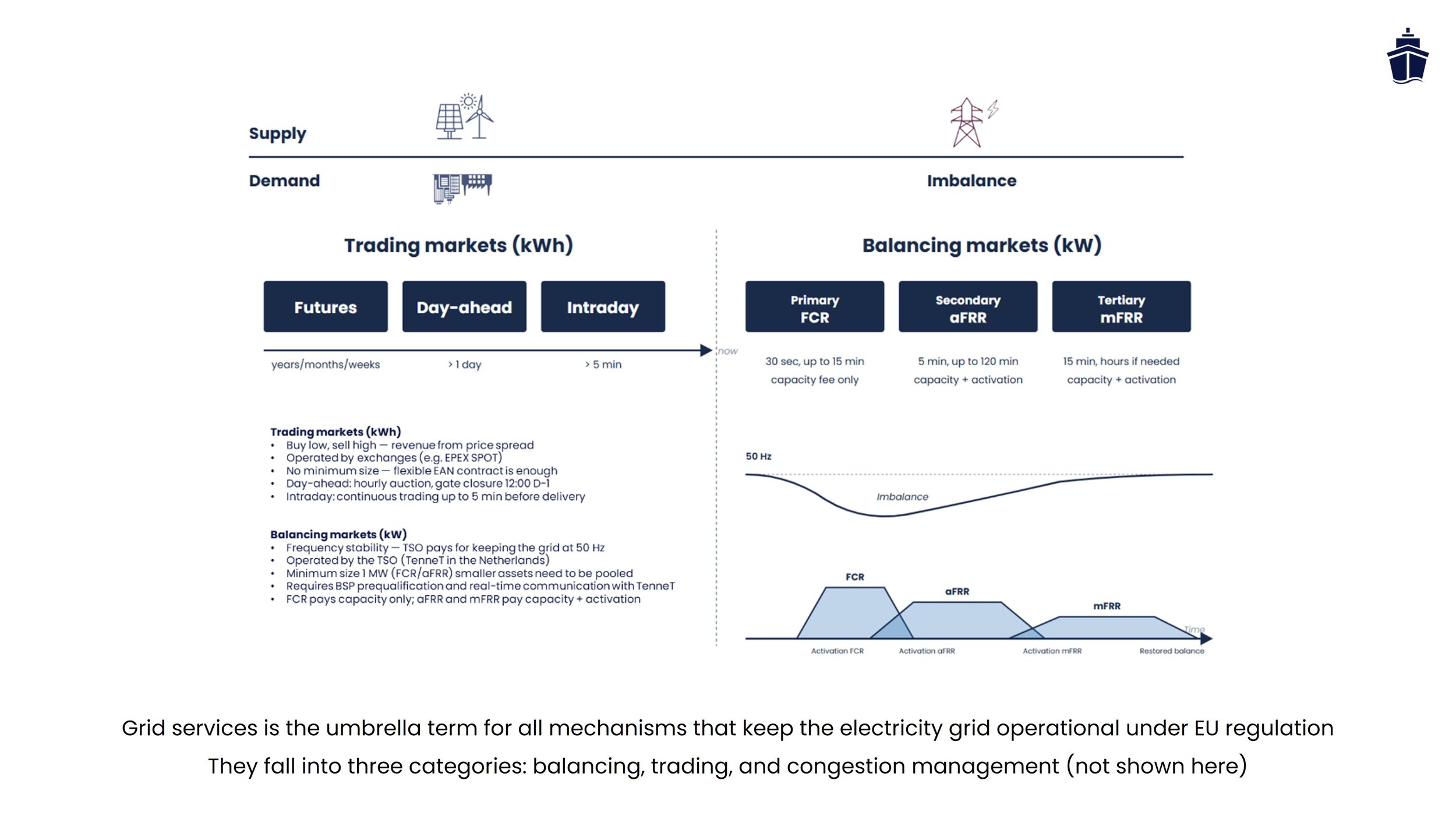 Grid services is the umbrella term for all mechanisms that keep the electricity grid operational under EU regulation. They fall into three categories: balancing, trading, and congestion management.
