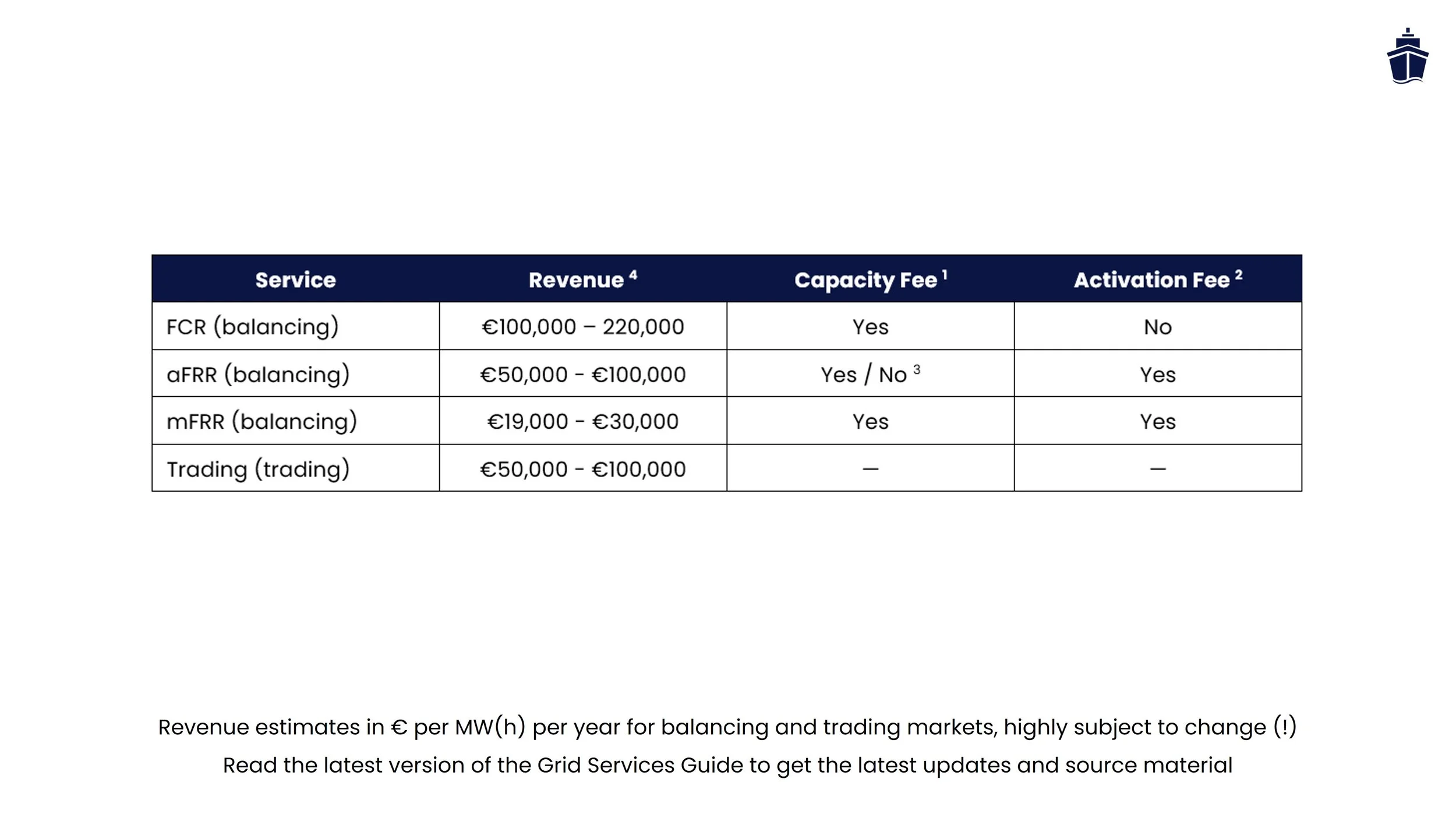 Revenue potential for all grid services varies wildly (a factor of 10 is not uncommon) and depends heavily on asset location, market conditions, and timing. Most detailed data from TSOs and operators is anonymized and available online in many cases. The ranges below are drawn from those public sources, field interviews, project experience and other and TSO transparency databases. In general a combination of aFRR and day-ahead trading yields the largest / easiest revenue. FCR was typically the highest grossing market, but this has changed due to a large amount of batteries coming online.